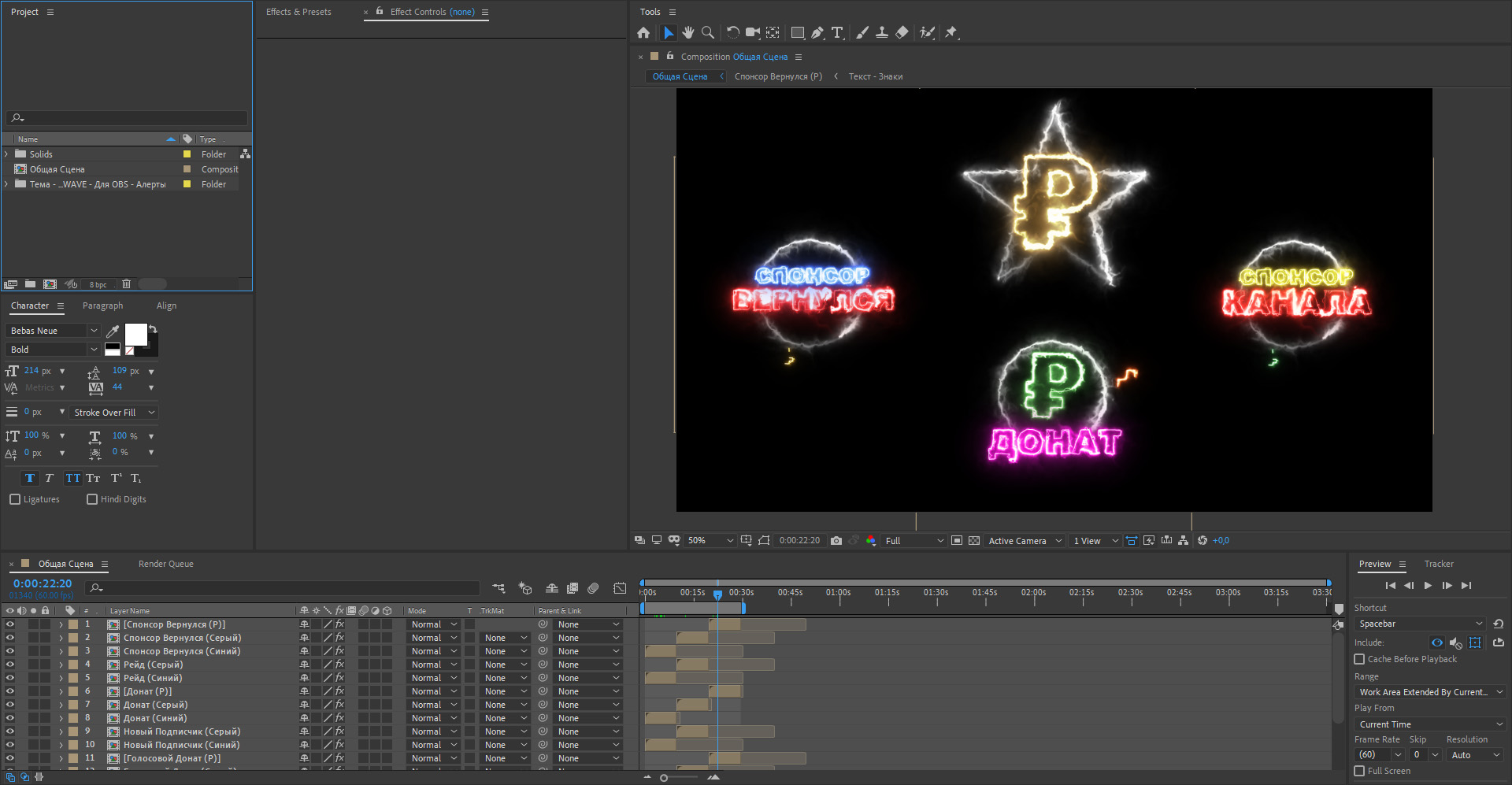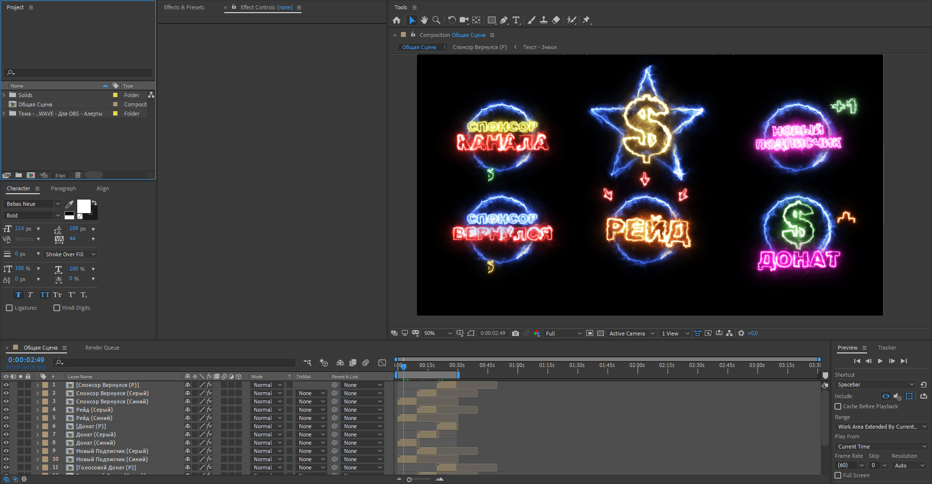 - После оплаты вы получаете Шаблон Алертов в формате .AEP. При помощи шаблона вы можете изменять вид, цвет и т.п. итоговой анимации, предварительно использовав кодек .WEBM при кодировании в After Effects.